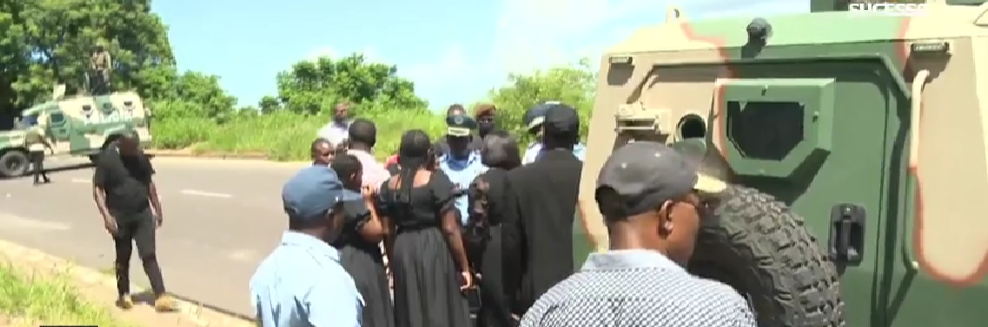 The blocking cause a stand-off between police and the marchers who initially tried to force their way with no success as the armoured vehicles were so placed so that no one could go through. Since the police would not budge, Azagaia’s widow got out of the hearse and tried negotiating with the police, initially to no avail.